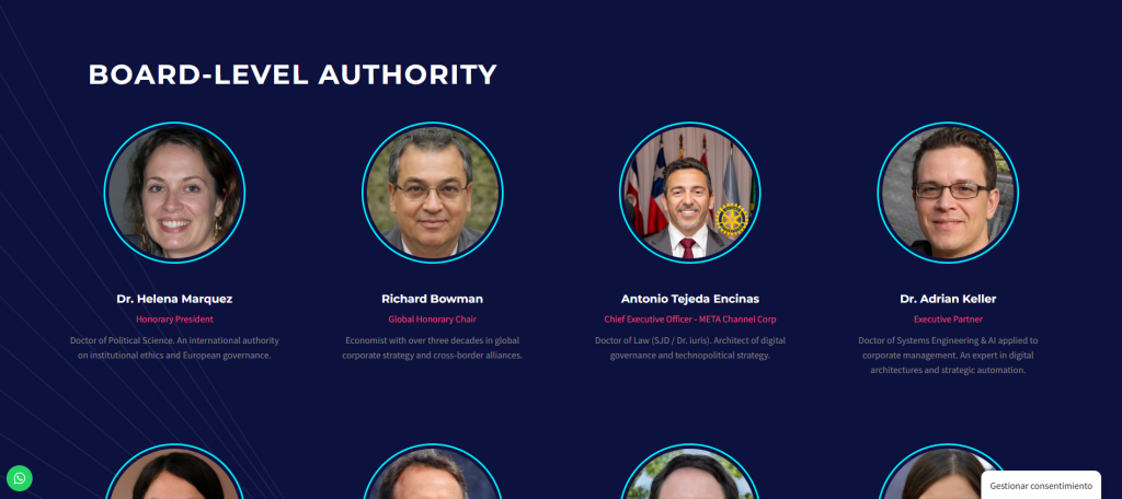 Meta Channel Corporation cuenta con un equipo multidisciplinar internacional, compuesto por perfiles estratégicos, tecnológicos y legales, lo que les permite abordar proyectos desde una visión integral y práctica, orientada a resultados.